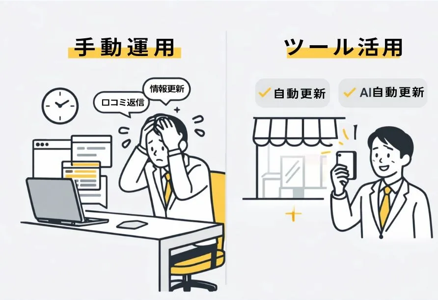 しかし、MEOが重要だとわかっていても、日々の業務に追われるオーナー様にとって「Googleビジネスプロフィールの定期的な更新」や「丁寧な口コミ返信」は、新たな負担になりかねません。