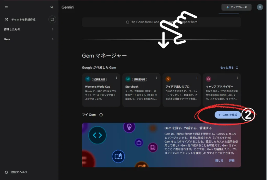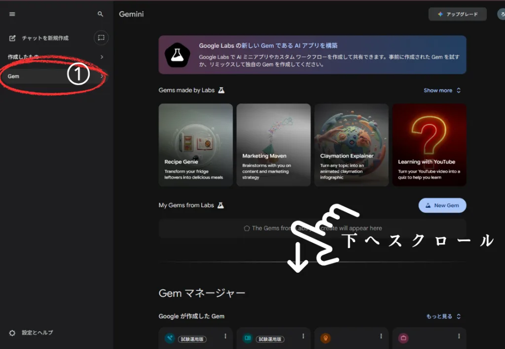 手順①:Geminiの左メニューから「Gemを作成」または「Gemマネージャー」をクリックします。