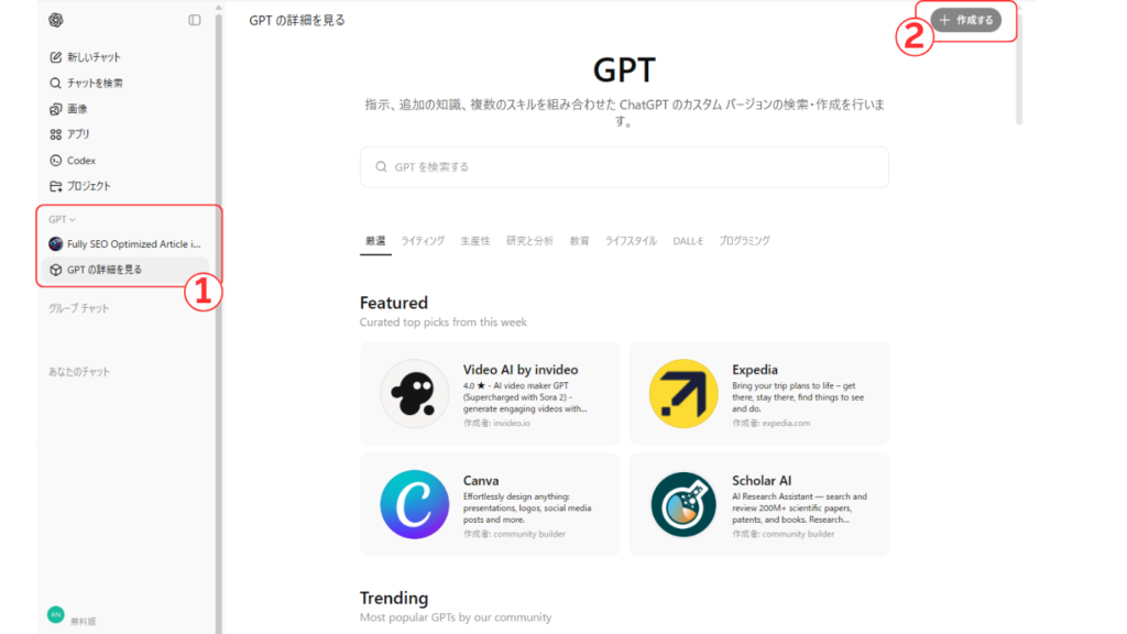 ※GPTが出てきていない方は、左側からプロジェクトをクリックしてください。