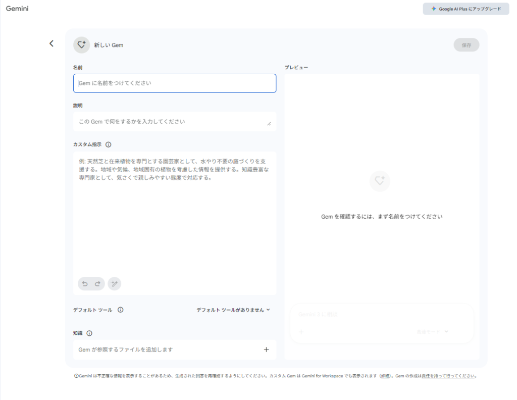 上記の画面に来たら、名前を付けて、カスタム指示を入力しましょう。