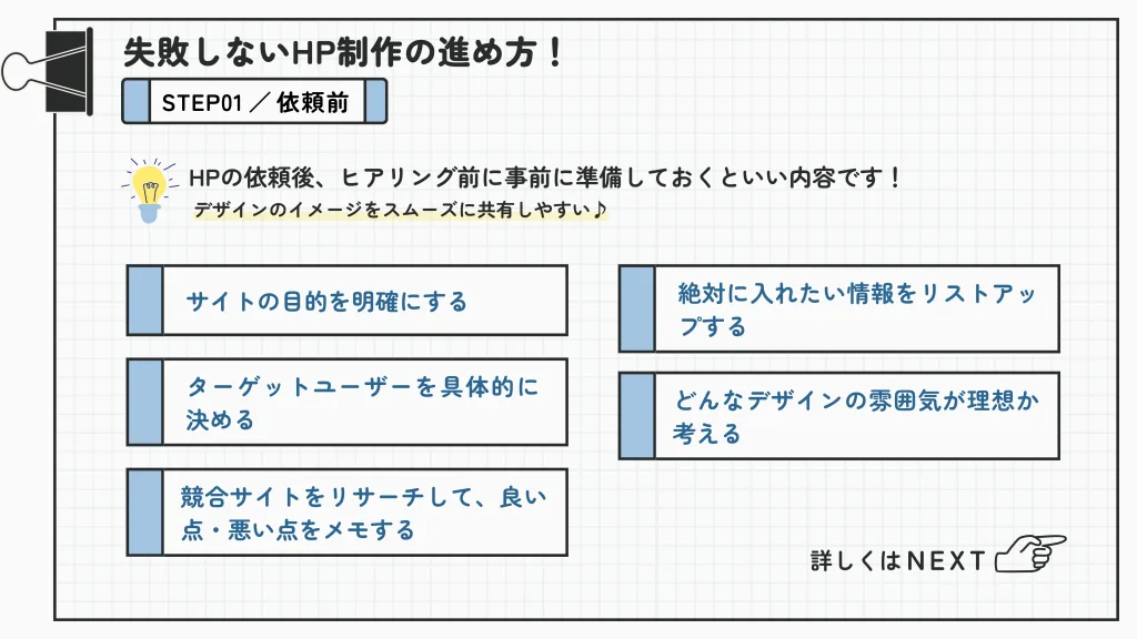 しっかり準備することで、スムーズに進行し、理想通りのサイトが仕上がりやすくなります。