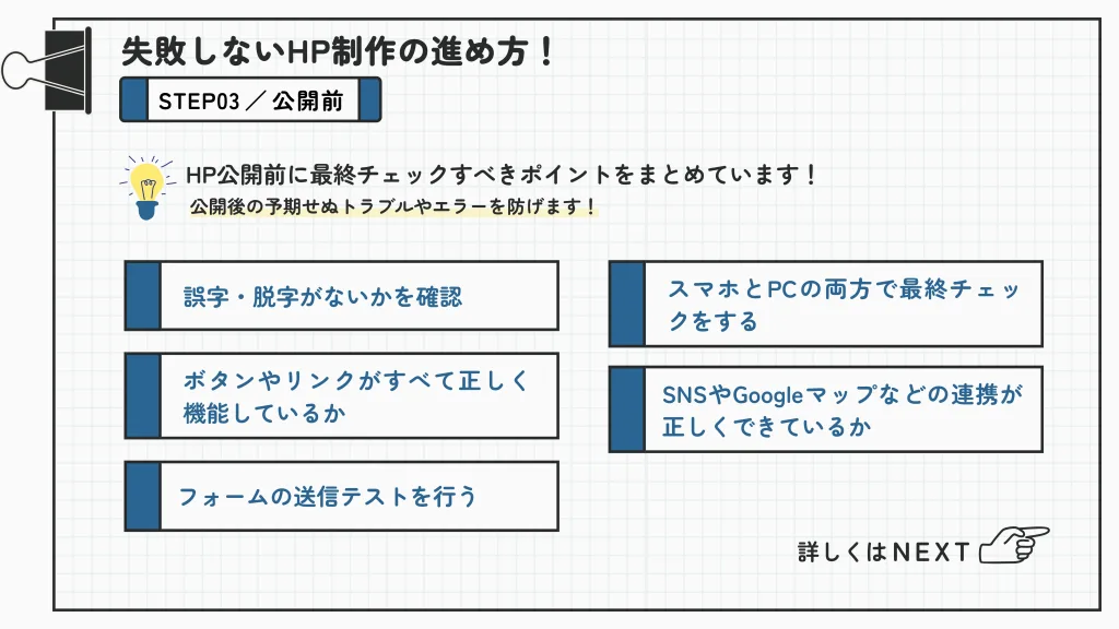 サイトの公開前には、実際のお客様が訪れることを想定して、すべてのページやボタン、リンク先を再確認しておきましょう。そうすることで、公開後に予期しない問題やエラーが発生するリスクを減らし、スムーズなユーザー体験を提供できます。また、見落としがちな誤字やリンクの不具合などを事前に修正できるため、信頼性の高いサイトを運営できるようになります。