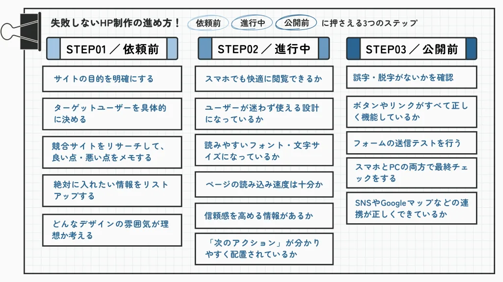 せっかく作ったHPが「見にくい」「分かりづらい」「問い合わせがこない」状態にならないよう、依頼前・進行中(修正確認時)・公開前の3つのタイミングでチェックしましょう!