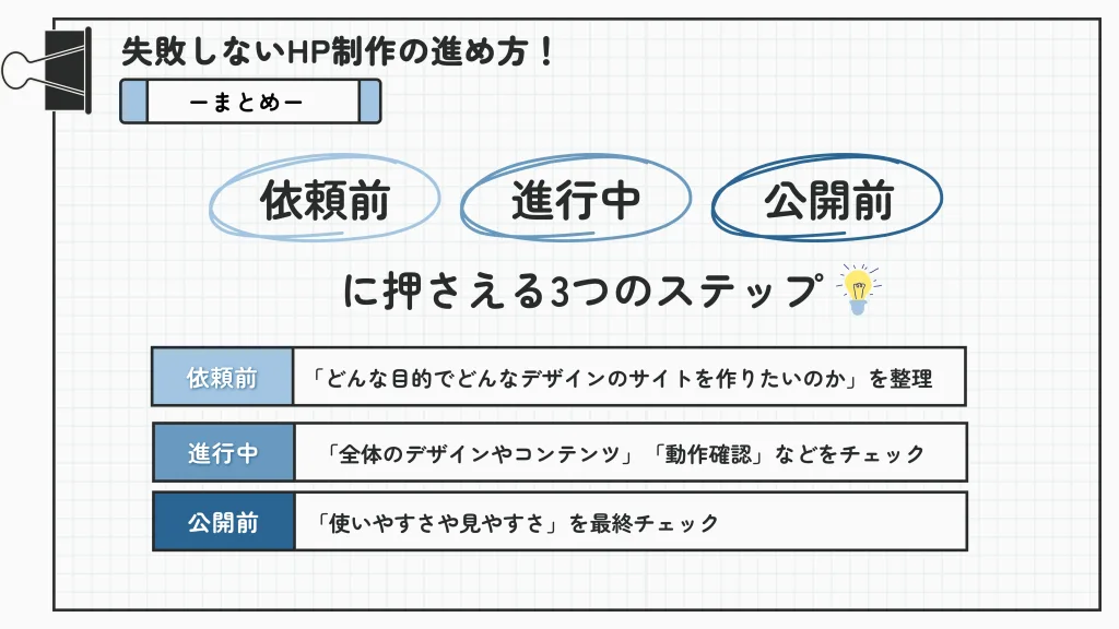 HPを依頼する前に「何を作りたいのか」を整理し、制作が進んできたら「使いやすさや見やすさ」を細かくチェックすることが大切です。