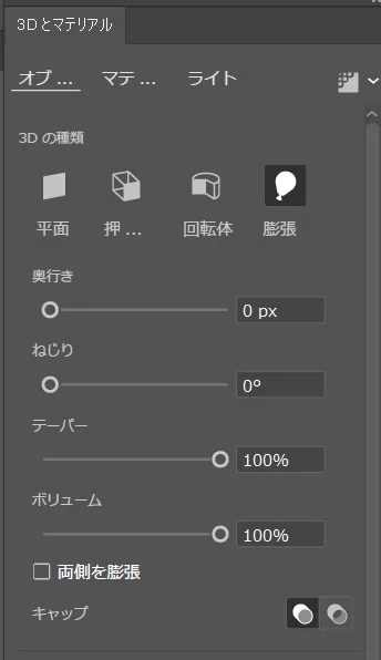 ウィンドウ>3Dとマテリアルパネルをクリック