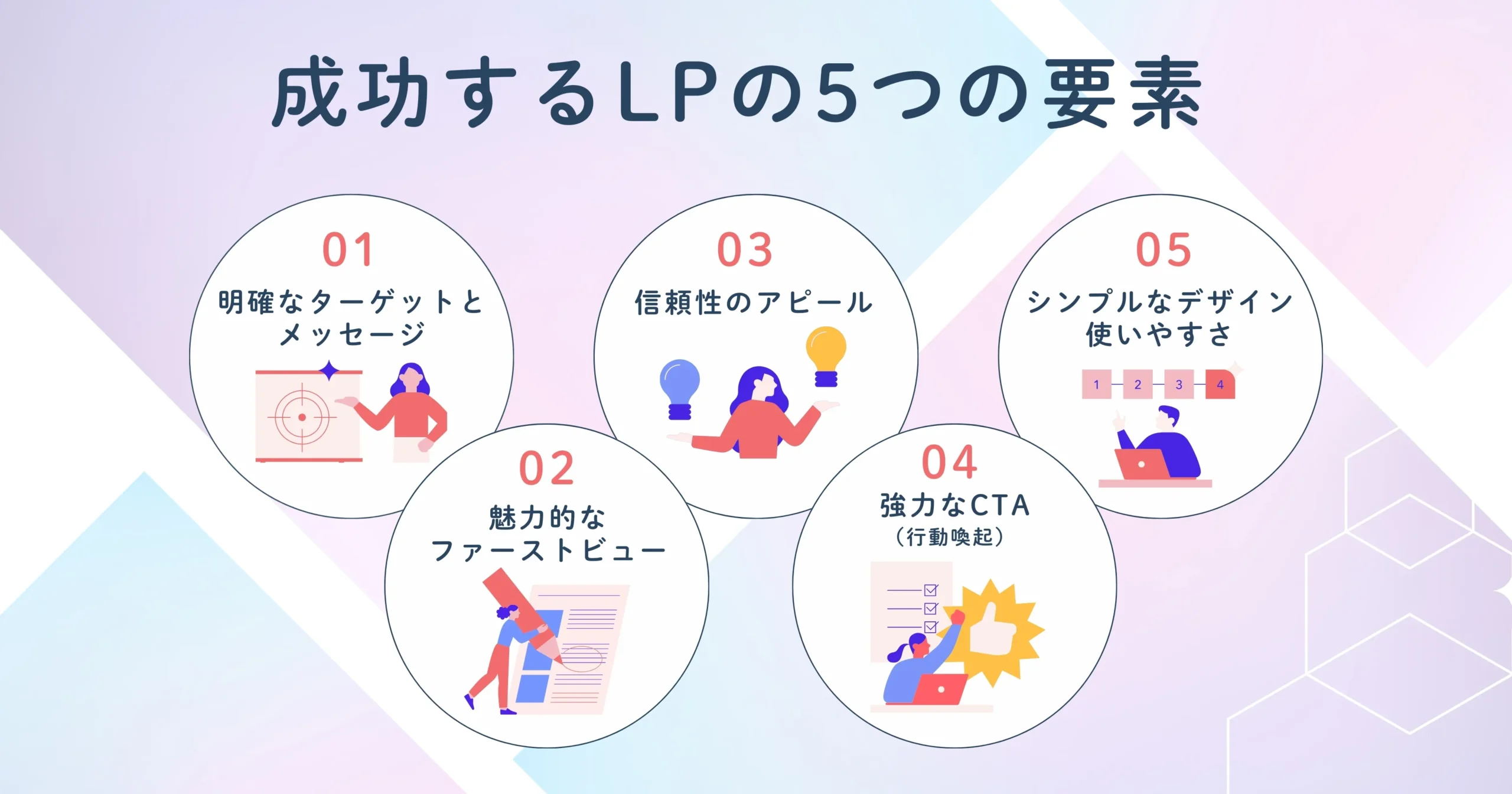 成功するランディングページ(LP)には、訪問者を最終的なアクションへと導くために、5つの重要な要素が欠かせません。まず、明確なターゲットとメッセージを設定し、訪問者が「自分に必要なもの」と感じるようにします。次に、魅力的なファーストビューを作り、訪問者の興味を引くことが重要です。